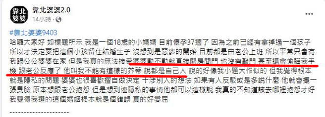一名18歲人妻在臉書社團「靠北婆婆2.0」投稿,她表示由於之前曾拿掉過1個孩子,這次決定要把孩子留住,結婚生子,目前也已經懷孕37週與公婆同住在家,但是她發現把孩子留住竟是惡夢的開始,她提到目前由老公上班賺錢,自己沒工作待在家,因此,平日會和婆婆、公公待在家,但是婆婆時常不敲門,就開門進房間,甚至還不時會偷瞄她的手機,抱怨自己的隱私都被看光光了。
